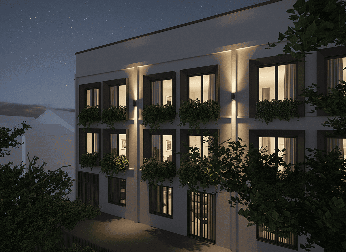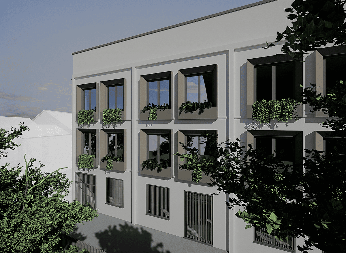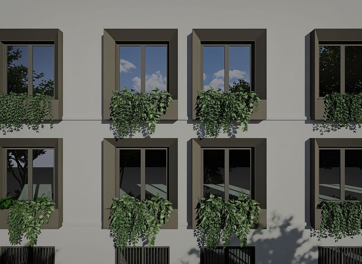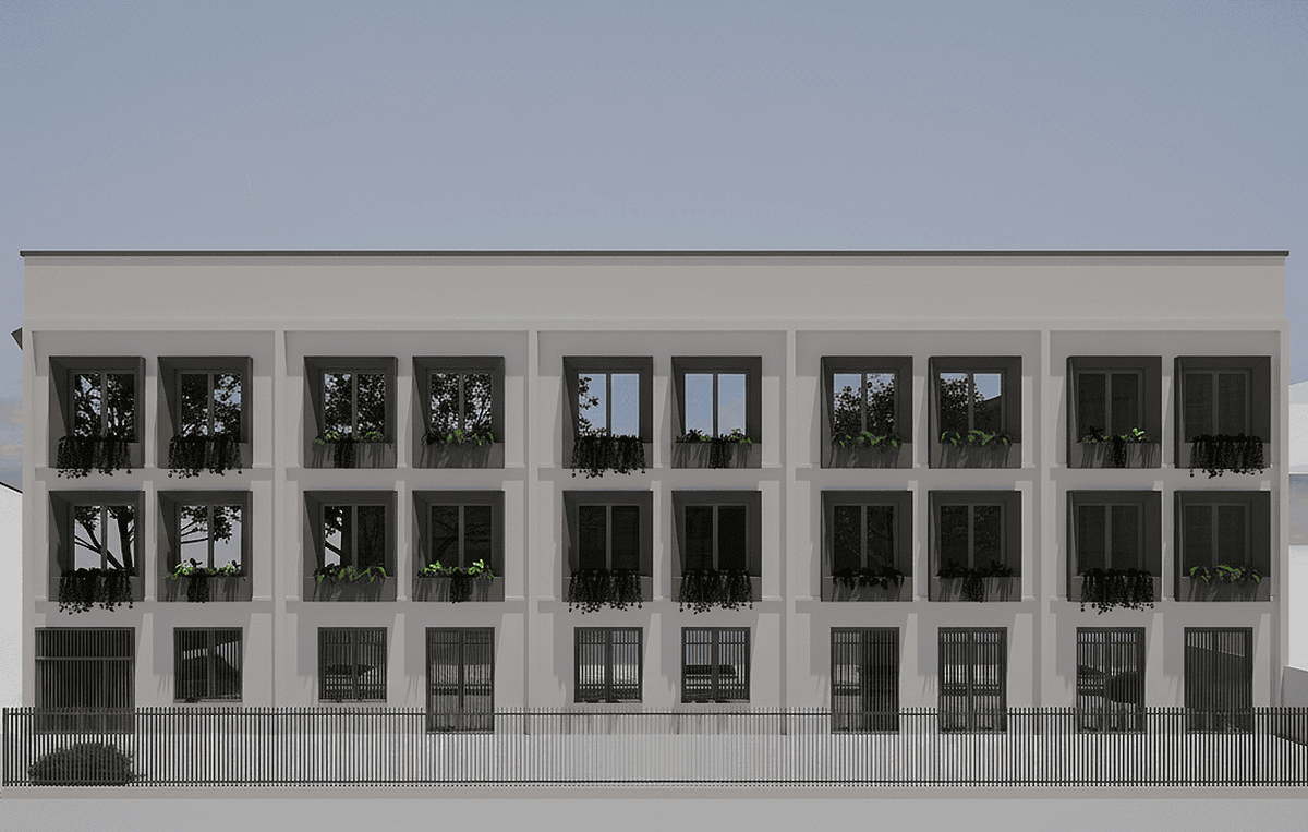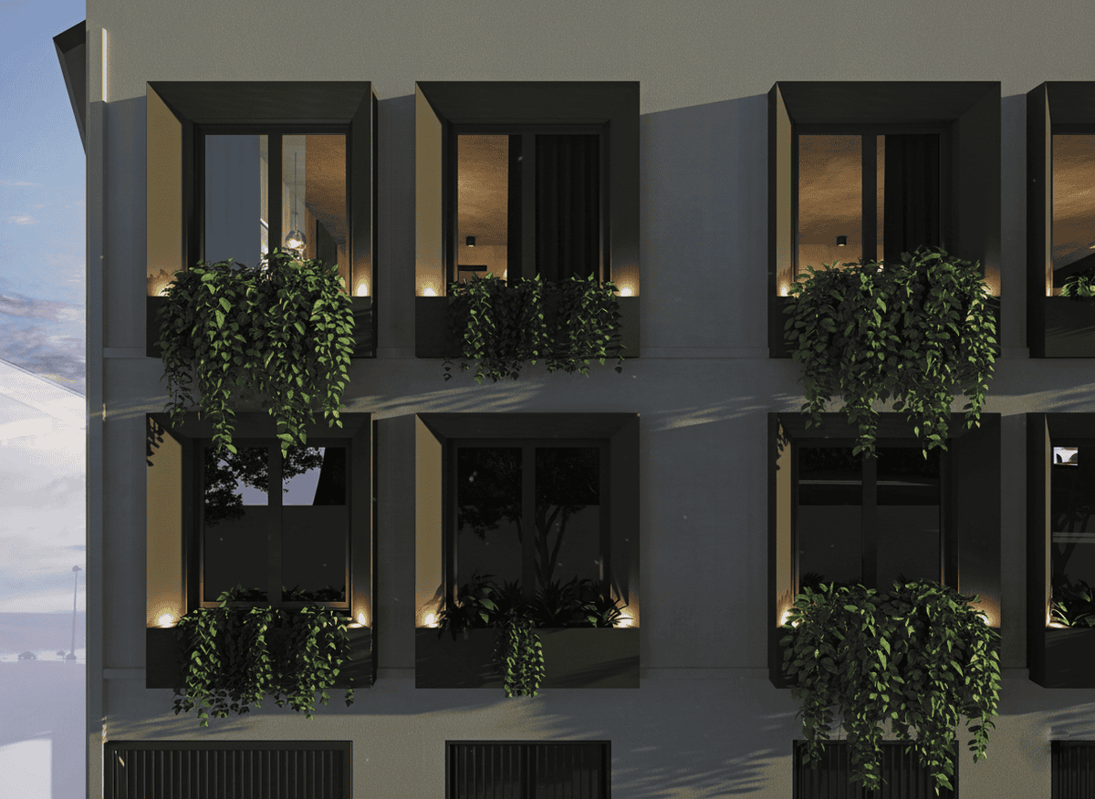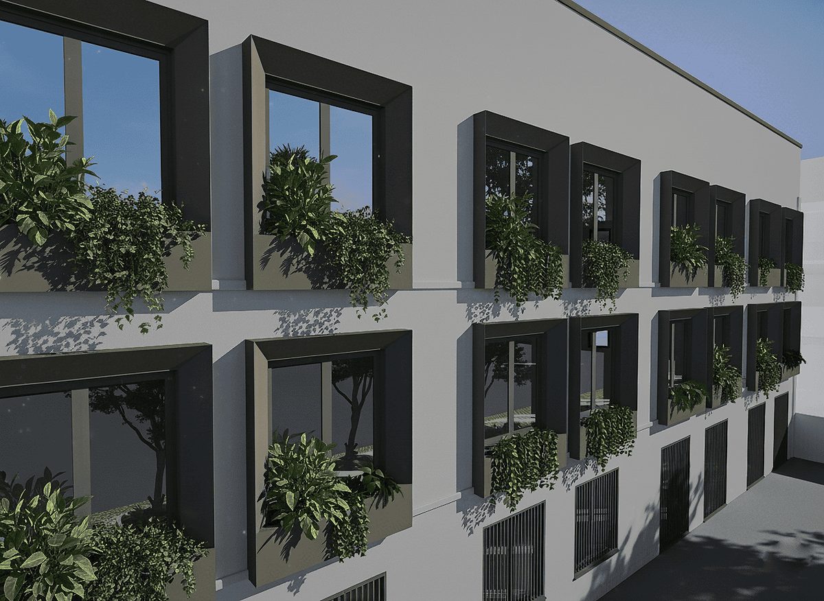 The exterior facade, characterized by a repeating pattern of square windows, has been redeveloped and highlighted through a window enhancement project. Aluminum frames with integrated solar lighting and space for plants have been applied to each window on the main facade facing Via Bazzi. These features help transform what was once an industrial building into a refined and contemporary residential image.