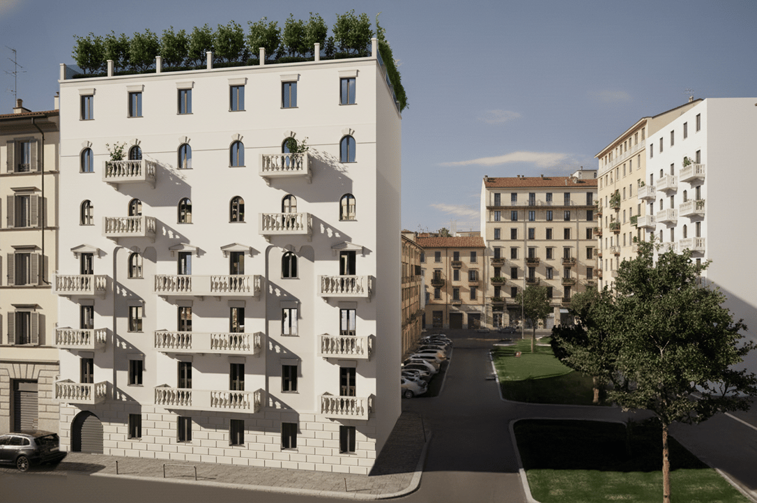 This building from the early 1900s is a six-story residential palazzo overlooking 300,000 sqm of parkland. It is located in a strategic position within the city of Milan, an area undergoing redevelopment through the urban regeneration project of the Farini and San Cristoforo railway yards.